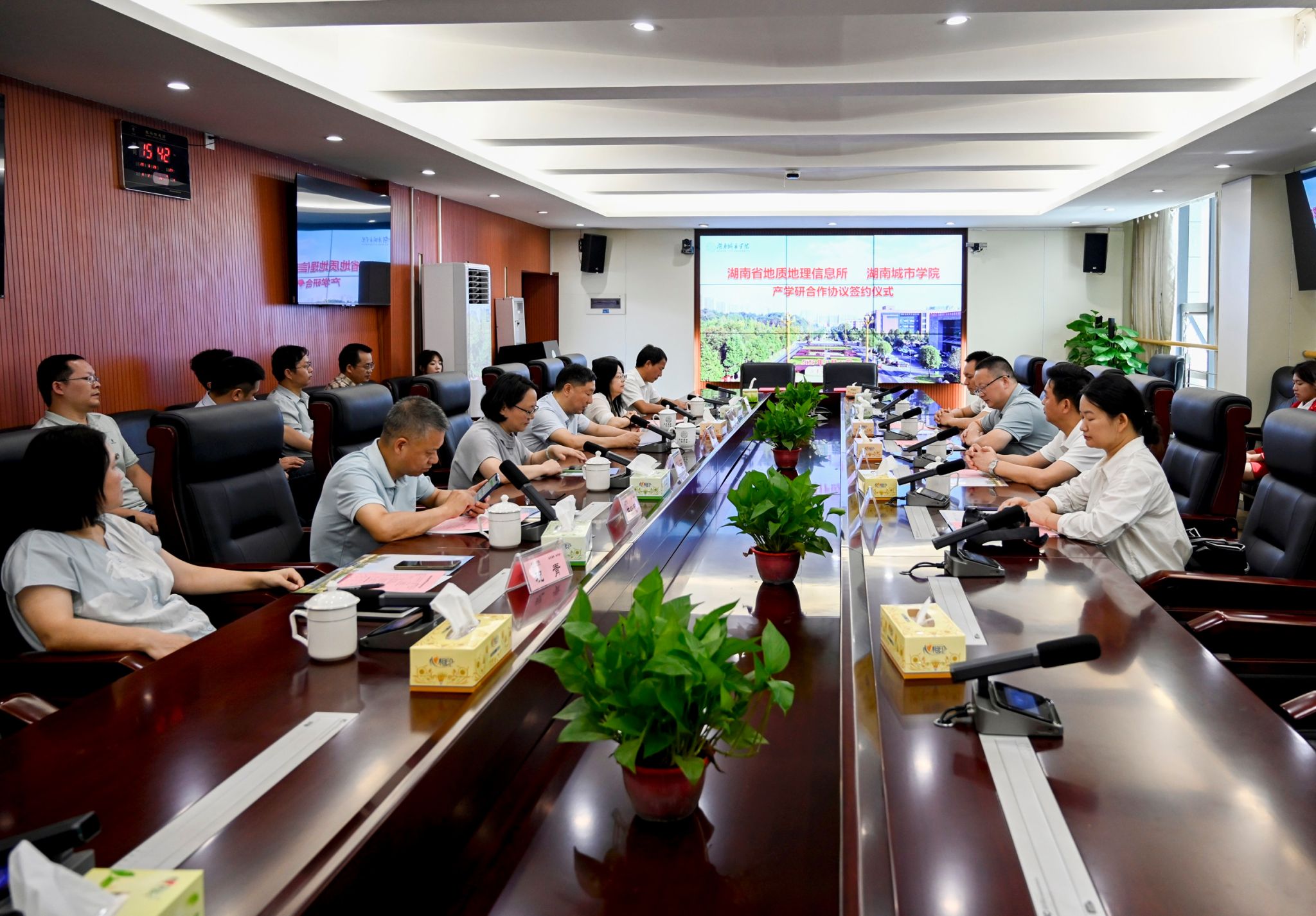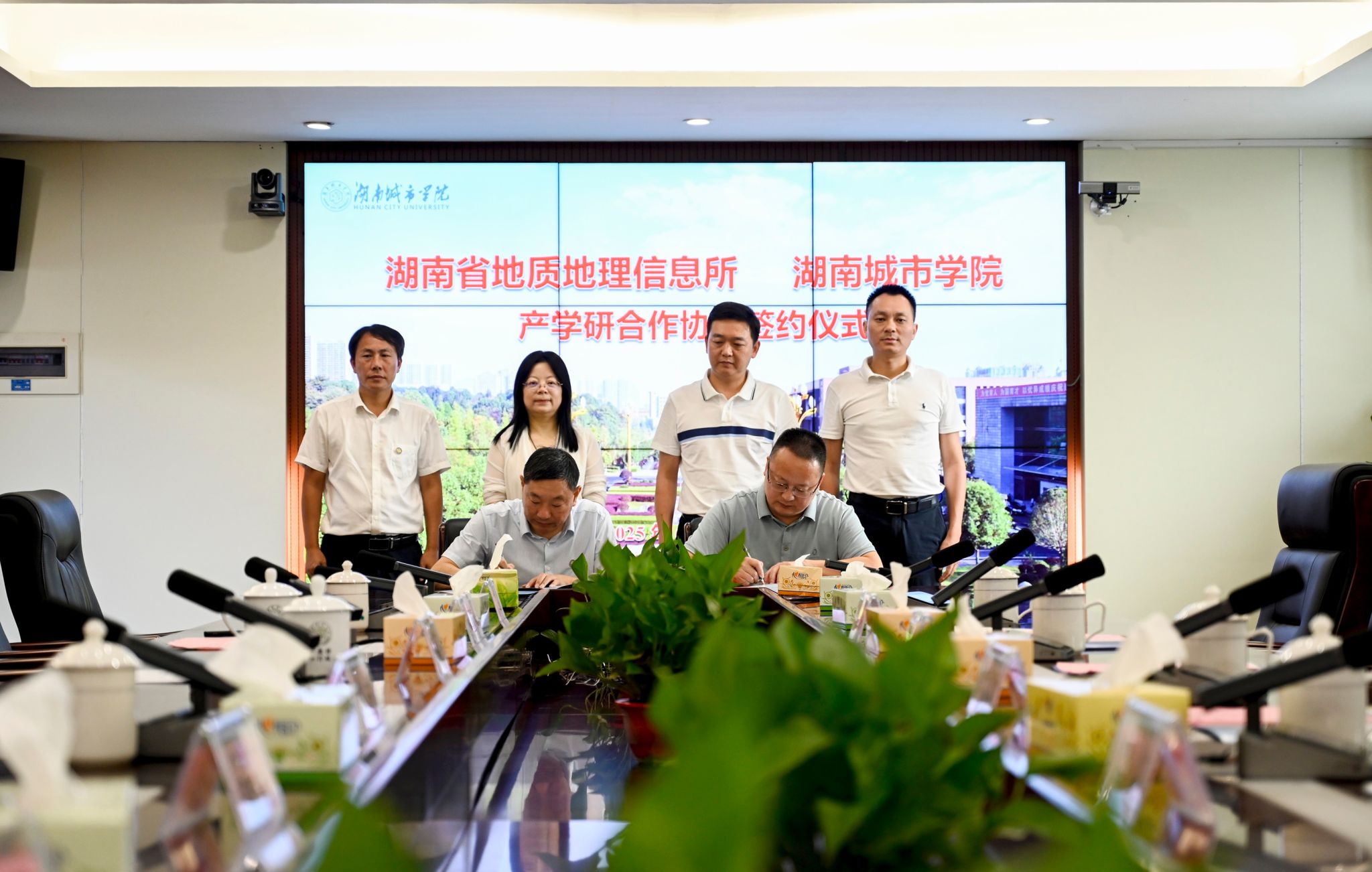 湖南省地质地理信息所相关人员,学校教务处、科研处领导,市政与测绘工程学院党政班子、系室中心主任和教师代表参加签约仪式。