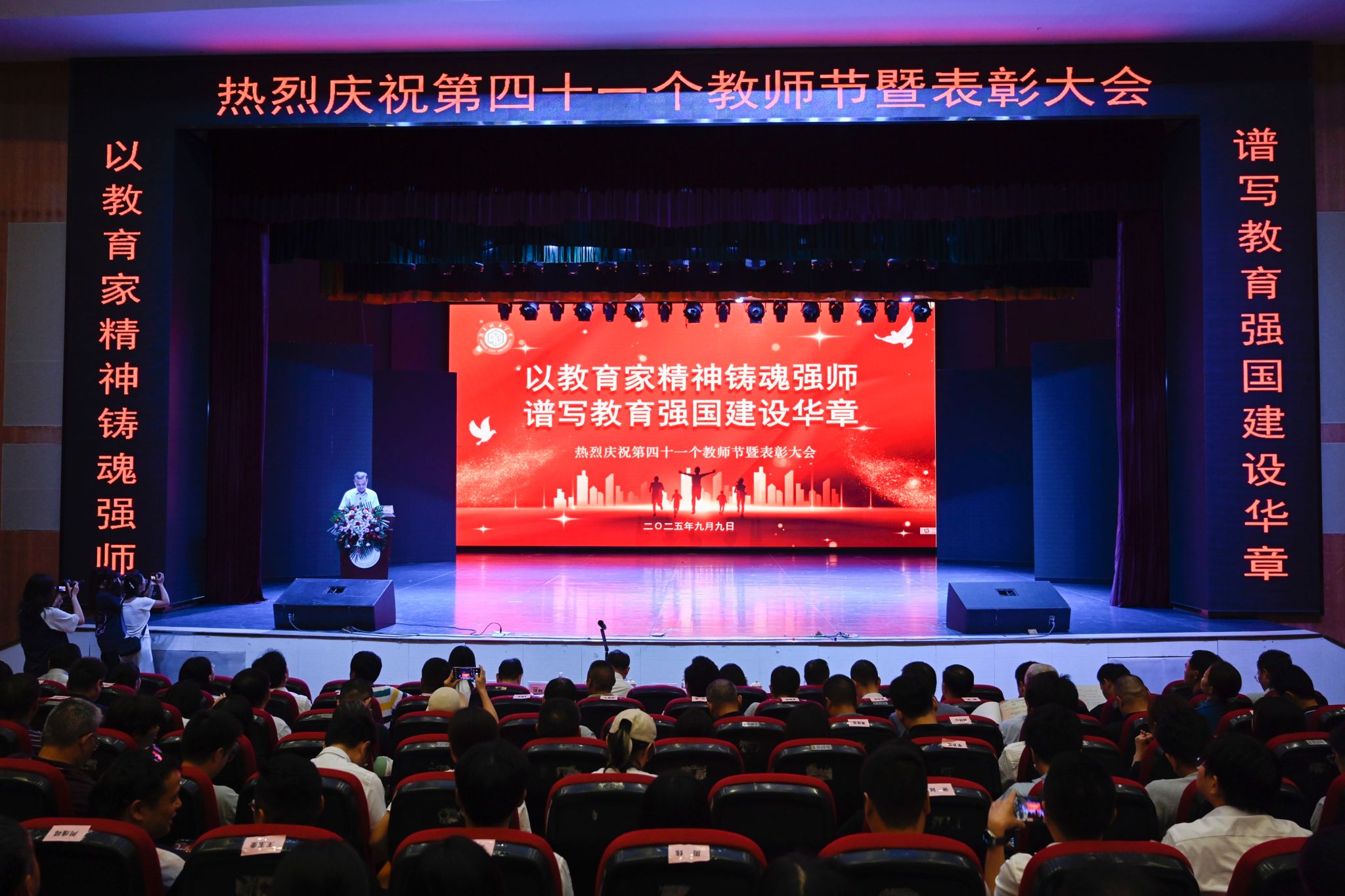 本网讯(通讯员 郑重宇) 9月9日下午,学校在音乐厅举行庆祝第41个教师节暨优秀教师表彰大会,全体校领导、各二级单位负责人以及受表彰对象、新进教师、教职工代表齐聚一堂,共同见证荣光,共话教育使命。