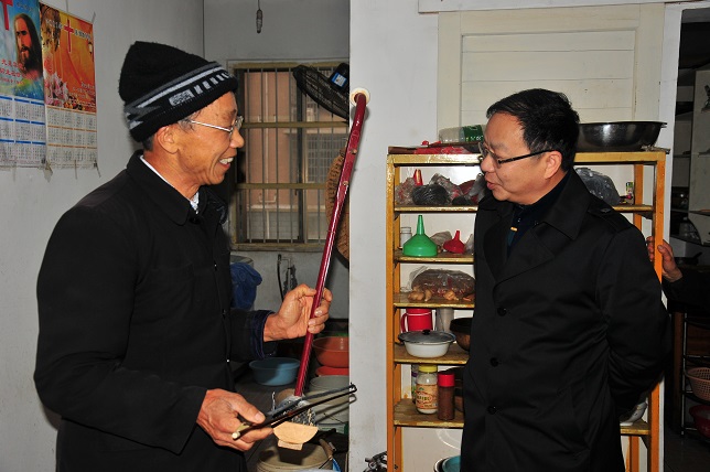 在教师新村退休教师杨绍先家中,校长李建华询问了他的家庭状况,高度赞扬了杨绍先积极乐观的心态。他握着杨绍先的手,叮嘱他要保重身体,树立信心,克服困难。