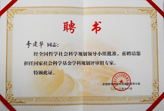 (本网讯)近日,李建华教授接到了全国社会科学基金项目规划办公室寄来的聘书,受聘为国家社会科学基金学科规划评审组专家。此次选聘是通过同行评审专家推荐、省委宣传部审核、中宣部部务会研究通过等严格程序,进一步实现了评委结构的年轻化和科学化。