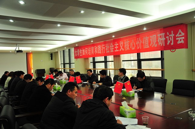 (本网讯) 为认真学习贯彻十八届三中全会精神,培育大学生社会主义核心价值观,33日下午,一场关于大学生如何培育和践行社会主义核心价值观的主题研讨会在办公楼三楼一会议室举行。党委宣传部、团委、学生工作处、教务处、马克思主义学院等部门负责人以及各二级学院党总支副书记参加了会议,校长李建华出席会议并作重要讲话。