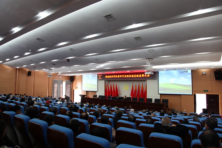 (本网讯)114日,离退休工作处负责组织举行了学校庆祝重阳节系列活动。上午9点,庆祝2014年重阳节暨表彰大会在图书馆报告厅举行。学校党委书记李建华,纪委书记、工会主席杨斌、益阳市老干部局副局长蔡志强、学校正厅级督学范志超、副厅级督学曹太康以及办公室、组织部、宣传部、教务处、团委、数学与计算学院等部门负责人,离退休老同志代表200余人出席大会。会议由杨斌主持。