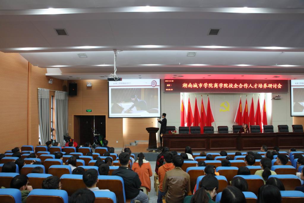 (本网讯)为了深化专业建设内涵、强化学生实践能力、提升人才培养质量,商学院精心打造校企合作人才培养平台,践行与市场和企业深度融合的人才培养模式,于11月8日成功举办了校企合作人才培养研讨会暨2013、2014级学生实习招聘会。受邀参加研讨会的企业和单位有省级校企合作示范基地湖南华天集团、杭州东方文化园旅业集团、湖南华翔翔能电气有限公司、湖南湘平路桥公司、益阳市人力资源和社会保障局等共23家。