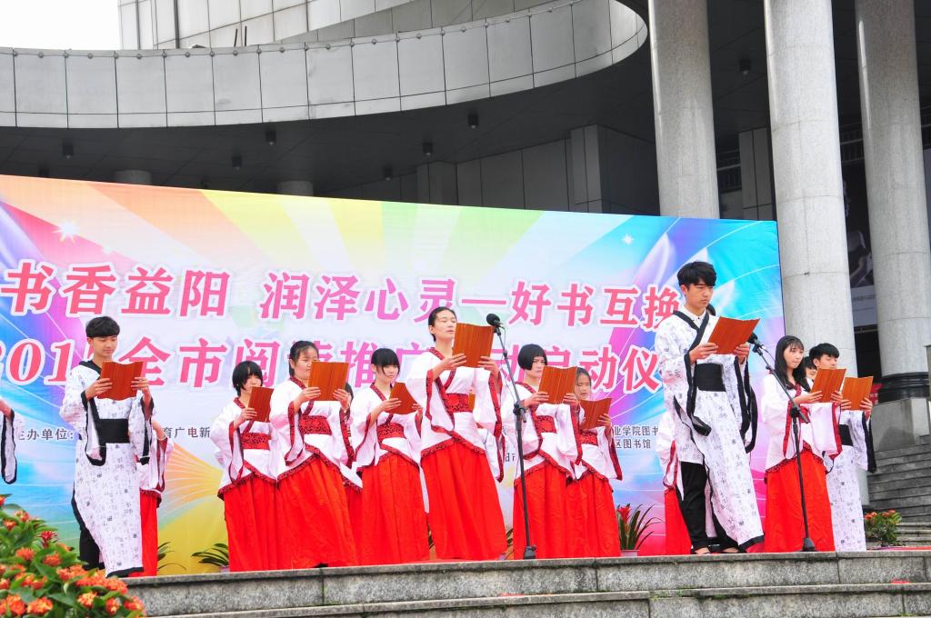 随着我校学生的诗朗诵《雨巷》,启动仪式慢慢拉开帷幕。一则《道德经》,一片国学海,我校人文学院学生着汉服、行汉礼的经典诵读引人入胜。随即,市图书馆馆长袁宁波宣读了“书香益阳·润泽心灵——好书互换”阅读共享倡议书,胡光华发表了“文化强市”推广全民阅读的讲话,我校人文学院学生钟贝纯作为市民代表发言,胡立安宣布全市阅读推广活动启动仪式正式开始。随后,来自各高校的学生文艺表演为市民带来了活力四射的青春气息,使活动现场气氛热闹非凡。