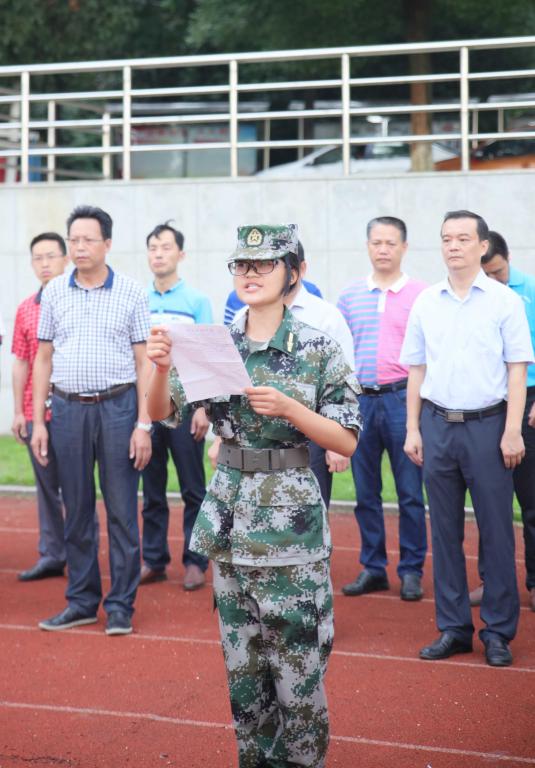 随后,人文学院16级网络与新媒体专业廖妍代表全体集训队员作表态发言。她表示,今天的授旗让我们感到无限光荣,更感到肩负的责任无比重大。在接下来的训练中,我们将继续发扬“流血流汗不流泪、掉皮掉肉不掉队的精神”,坚定信念、严守纪律、刻苦训练,努力锻造成为服从指挥、纪律严明、素质过硬的教官群体。
