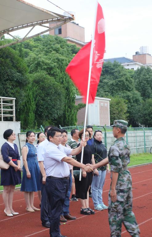 (本网讯)7月5日清晨,我校学生教官集训队授旗仪式在校田径场举行。党委书记罗成翼、副校长雷存喜,宣传部、教务处、学生工作处、团委负责人,各二级学院党委(党总支)副书记以及104名学生教官集训队队员参加了授旗仪式。