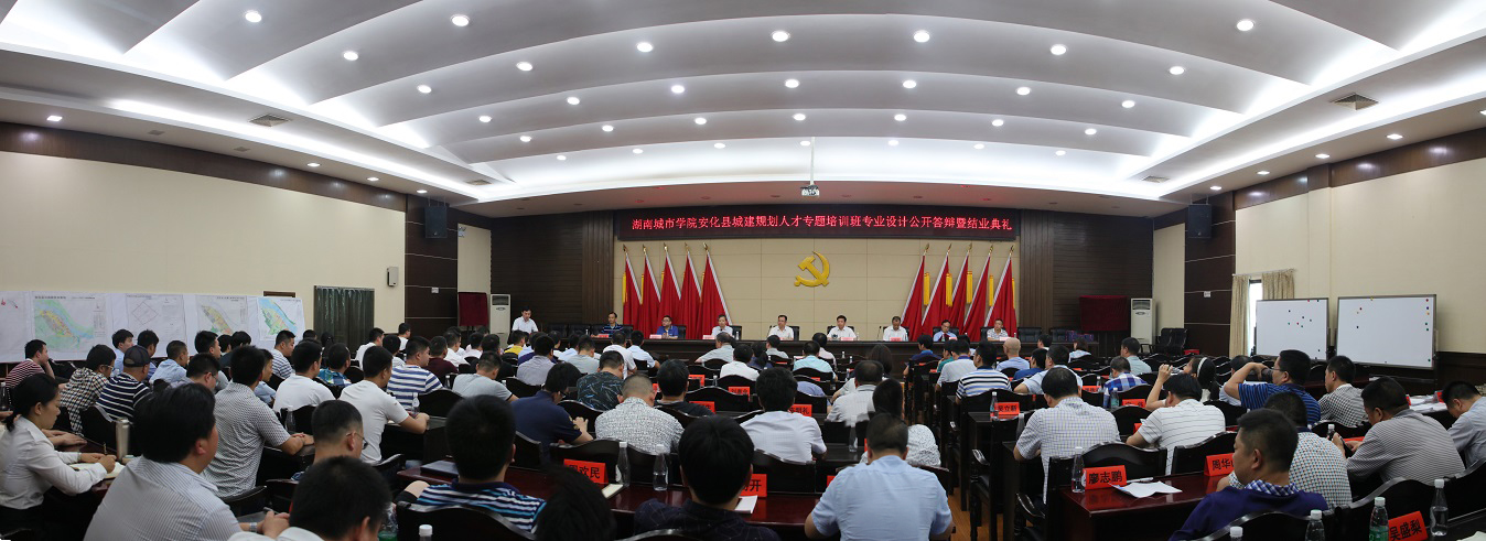 (本网讯)7月18日上午,由我校继续教育学院承办的安化县城建规划人才专题培训班在安化县会议中心电视电话会议室举行了专业设计公开答辩与结业典礼。校长李建奇、副校长夏宏宇、副校长郑卫民,安化县委书记熊哲文、县委副书记王新宇、县人大常委会主任李太源,县委常委、组织部部长陈飞燕,副县长彭加军出席典礼,我校继续教育学院相关负责人、答辩专家组成员以及安化县各行政部门、23个乡镇党委书记参加典礼。