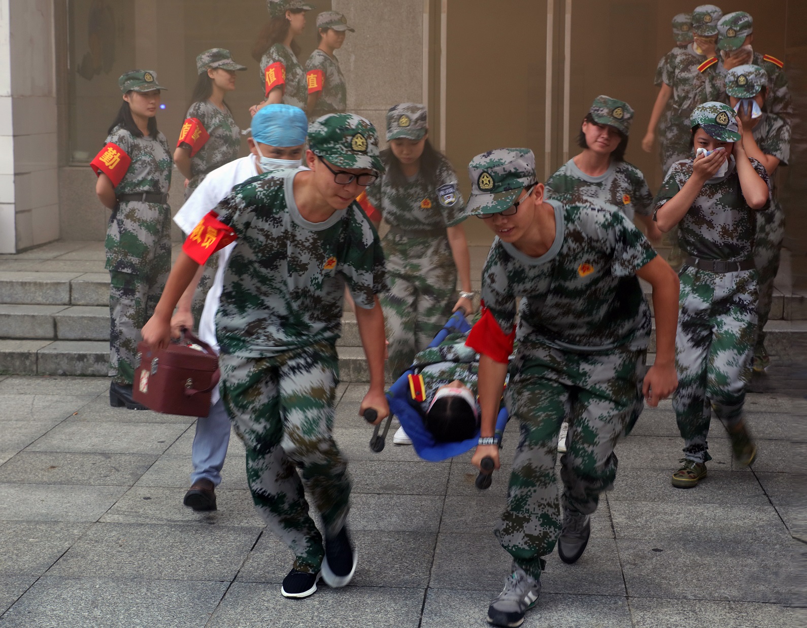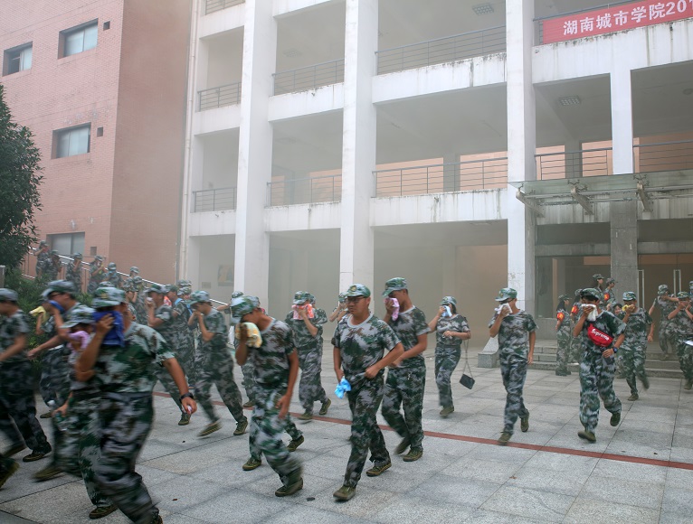 在义务消防员的指引下,在教室的4500余名新生用随身携带的湿毛巾捂住口鼻,根据墙面逃生标识有秩序的从各个安全通道撤离