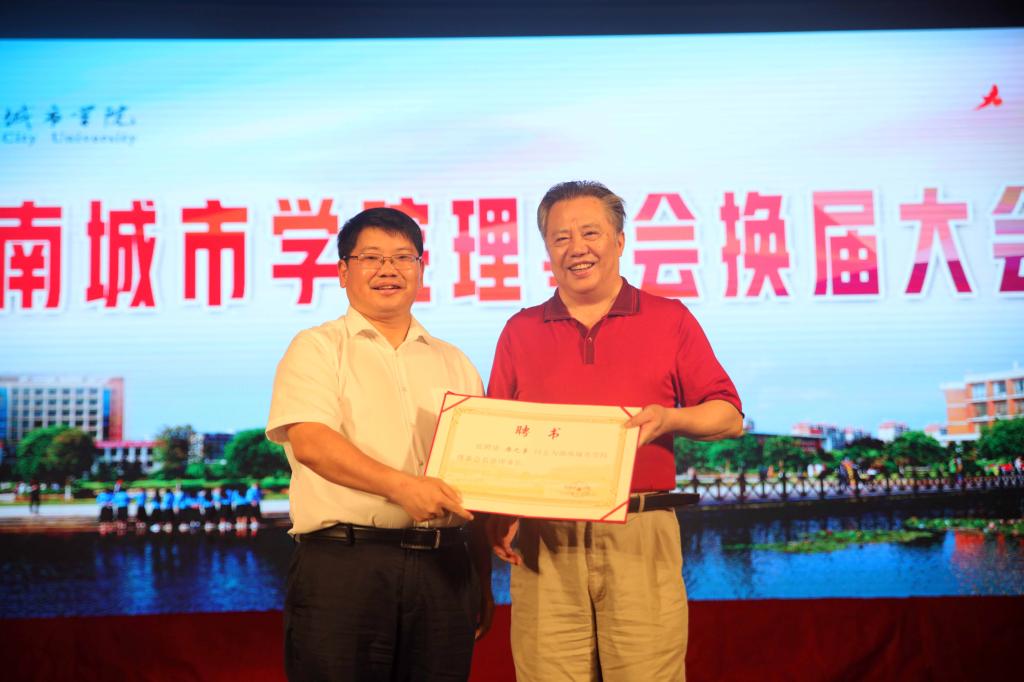 罗成翼为我校理事会名誉理事长唐之享、名誉副理事长原华体网页版党委书记李新国、赵运林颁发聘书。