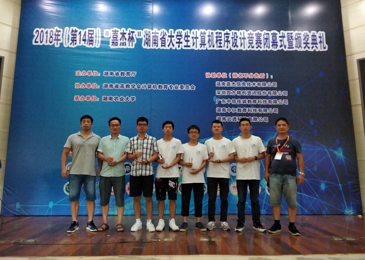 (本网讯)2018年9月1日至2日,2018年第十四届“嘉杰杯”湖南省大学生计算机程序设计竞赛在湖南农业大学举行。来自国防科技大学、中南大学和湖南大学在内的43所高等院校的303支代表队,近千名学生参赛,我校信息与电子工程学院参赛选手在阳俊、陈浩和廖枝平等教练团队的带领下,经过激烈角逐,最终获得一等奖2项,二等奖2项,三等奖2项,获奖成绩在全省同类本科院校中名列前茅。