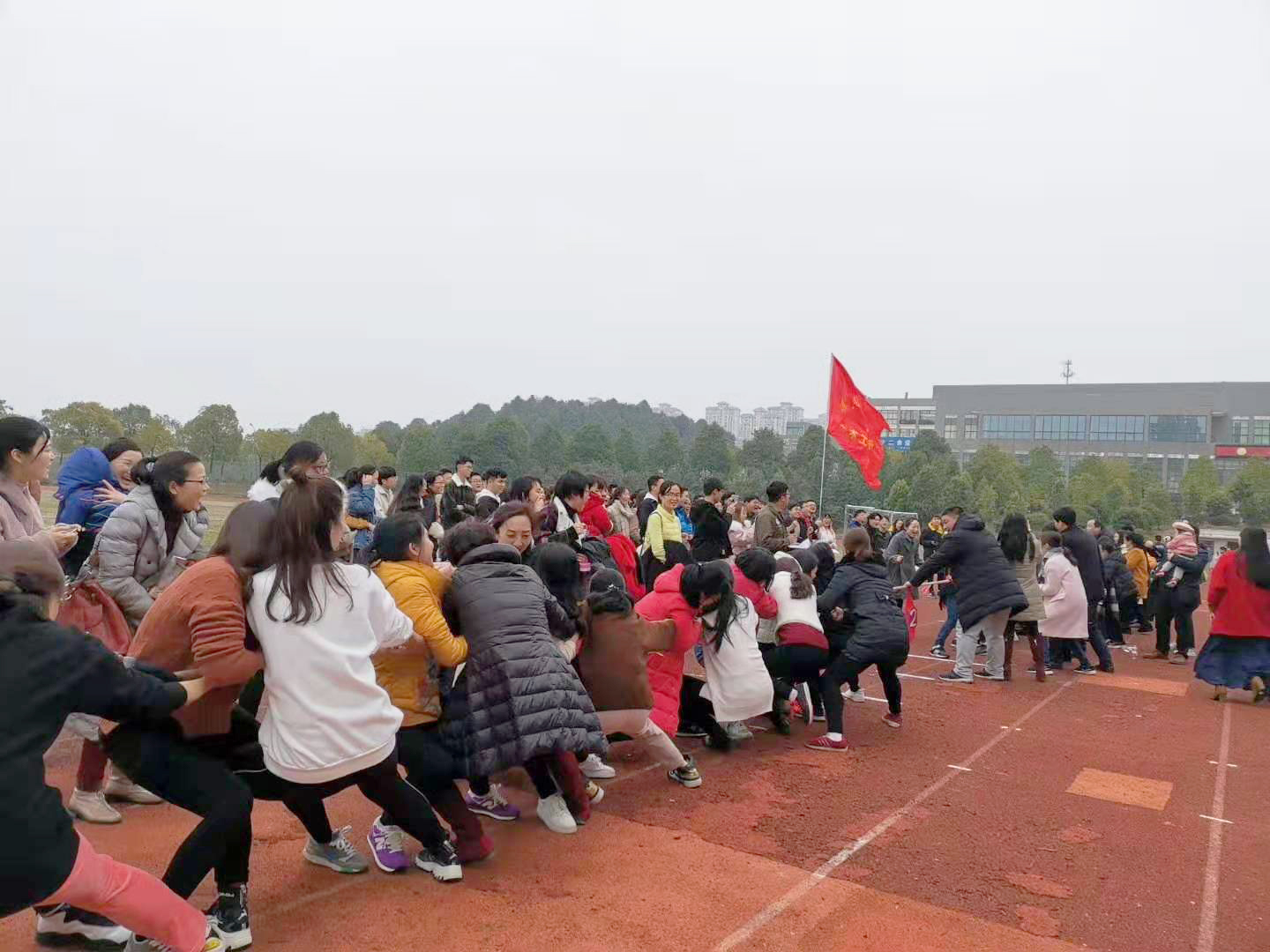 (本网讯)2019年3月7日下午,我校在学校田径场举行了庆 “三八”妇女节拔河比赛。全校女教职工组成12支队伍共200多人参加了比赛。