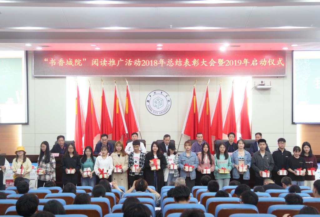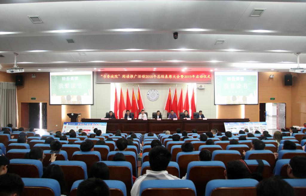 (本网讯)为响应党中央关于“全民阅读”和“共建书香社会”精神,庆祝第24个“世界读书日”,2019年4月23日,我校在图书馆报告厅举行“书香城院”阅读推广活动2018年总结表彰大会暨2019年启动仪式。副校长夏宏宇、雷存喜,党委委员、宣传部长李斌,教务处、学生工作部(处)主要负责人,各二级学院党委(总支)副书记、图书馆领导班子成员、图书供应商代表以及近400名学生代表参加了仪式。