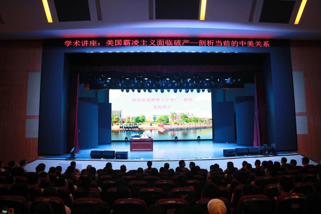 (本网讯)2019年9月8日晚,湘潭大学李广一教授应邀来校,在学校音乐厅作了一堂题为“美国霸凌主义面临破产——剖析当前的中美关系”的学术讲座。党委书记罗成翼,校长李建奇,纪委书记姚春梅,副校长雷存喜,党委委员袁志成以及师生代表共500余人聆听了讲座。讲座由罗成翼主持。