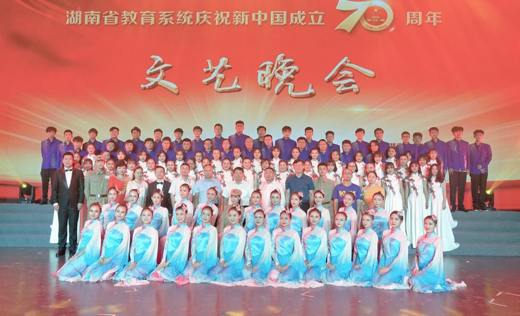 (本网讯)2019年9月10日晚,由省委教育工委、省教育厅、省教育工会联合主办,湖南师范大学承办的庆祝新中国成立70周年文艺晚会在湖南省人民会堂举行。省委副书记乌兰等省领导出席,学校党委书记罗成翼,副校长、工会主席郑卫民现场观看了演出。