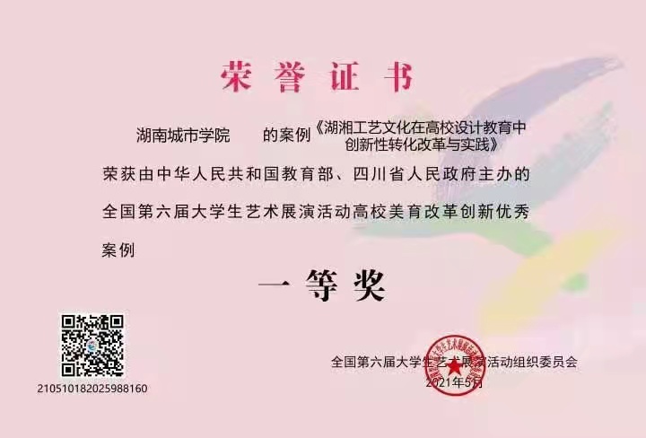 本网讯(通讯员 郑学达)2021年5月12日,由教育部、四川省人民政府共同主办的第六届全国大学生艺术展演活动在成都城市音乐厅落下帷幕,我校美育改革创新案例《湖湘工艺文化在高校设计教育中创新性转化改革与实践----以华体网页版为例》荣获一等奖,这是自我校参加全国大艺展活动获得的最高荣誉表彰。
