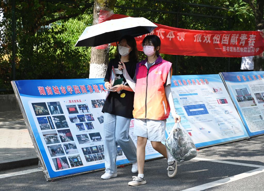 满载着新生和行李的电瓶车往复行驶在校门与迎新点之间。