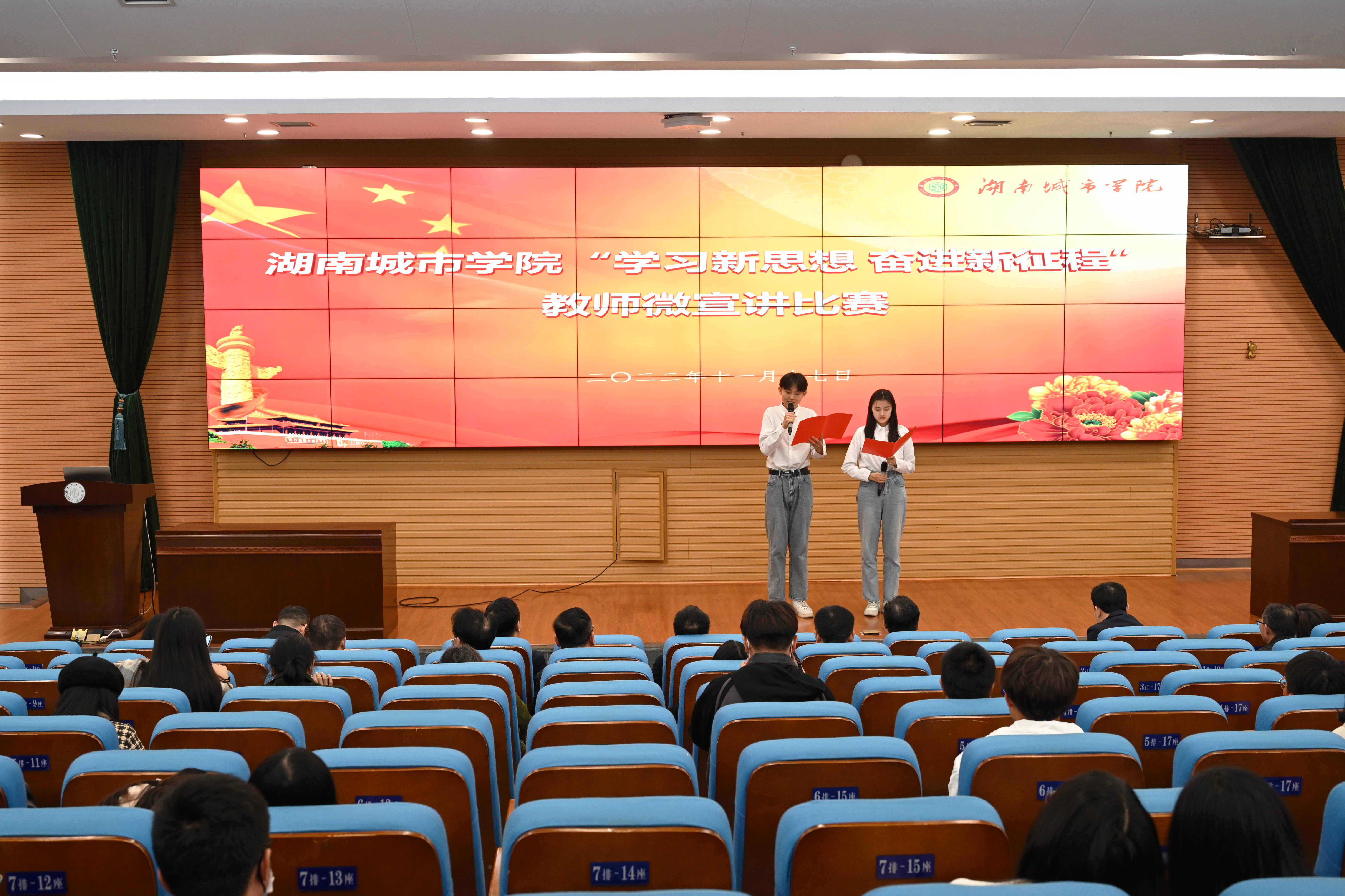本网讯(通讯员 周文娟)“党的二十大开启了以中国式现代化全面推进中华民族伟大复兴的新征程,中国式的现代化需要现代化的人才做支撑……” 11月17日,华体网页版“学习新思想,奋进新征程”教师微宣讲比赛在图书馆报告厅举行。来自各二级单位的18位参赛选手们围绕党的二十大报告,从党的二十大的历史地位与重大意义、党的二十大精神等方面,用“小故事”诠释“大道理”,将党的创新理论送到师生的心坎上。党委副书记何旭娟,副校长袁志成,党委委员、组织部部长吕贤军出席。