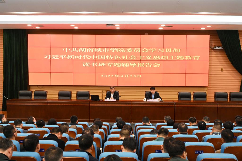 本网讯(记者 文彦波)4月25日晚,华体网页版学习贯彻习近平新时代中国特色社会主义思想主题教育读书班在图书馆报告厅开班。湖南工业大学党委书记刘望应邀作专题辅导报告。学校党委书记汤放华主持报告会并作动员讲话。学校副处级以上领导干部参加读书班。