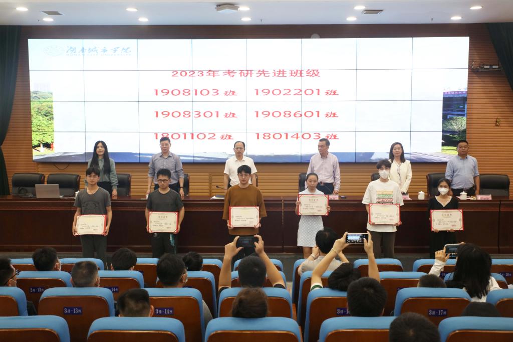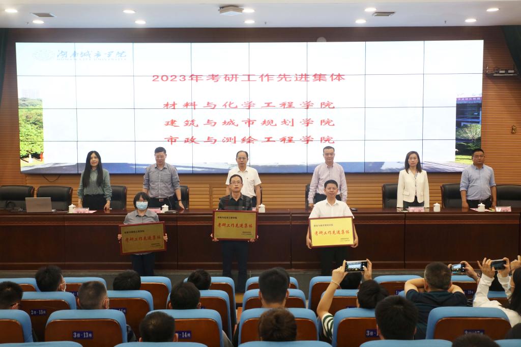 会上,陈列尊宣读了《关于表彰2023年考研工作先进单位的决定》。2023年,我校部分二级学院和班级在考研工作中表现优异,其中,材料与化学工程学院、建筑与城市规划学院、市政与测绘工程学院三个学院被授予“考研工作先进集体”称号,考研录取率分别为29.23%、23.33%、22.40%土木工程学院、美术与设计学院/国际教育学院两个学院被授予“考研工作进步奖”称号,1908103、1902201、1908301、1908601、1801102、1801403等6个班级被授予“考研先进班级”称号。随后,出席会议的领导向获奖集体现场颁发了奖牌(状)。