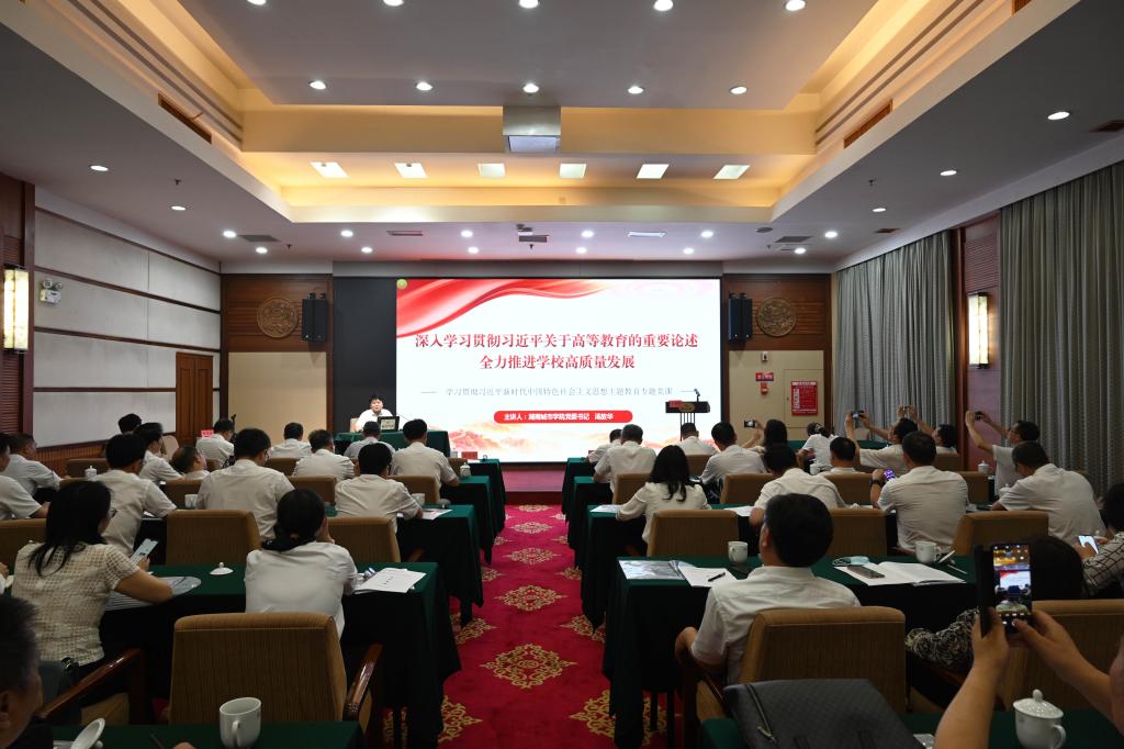 下午,全体成员在韶山宾馆会议室进行了“以学增智”专题学习研讨。汤放华以《深入学习贯彻习近平关于高等教育的重要论述 全力推进学校高质量发展》为题,为大家上了一堂深刻的党课。汤放华紧密结合当前高等教育新形势和学校发展新情况,通过详实的数据对比、丰富的案例讲解,从领会精神、再学习再思考习近平总书记关于教育重要论述,审时度势、切实增强教育强国的责任感使命感和紧迫感,狠抓落实、谱写新时代新征程华体网页版高质量发展新篇章三个方面,阐述了学习贯彻习近平总书记关于教育的重要论述我们要做什么、怎么做的问题。