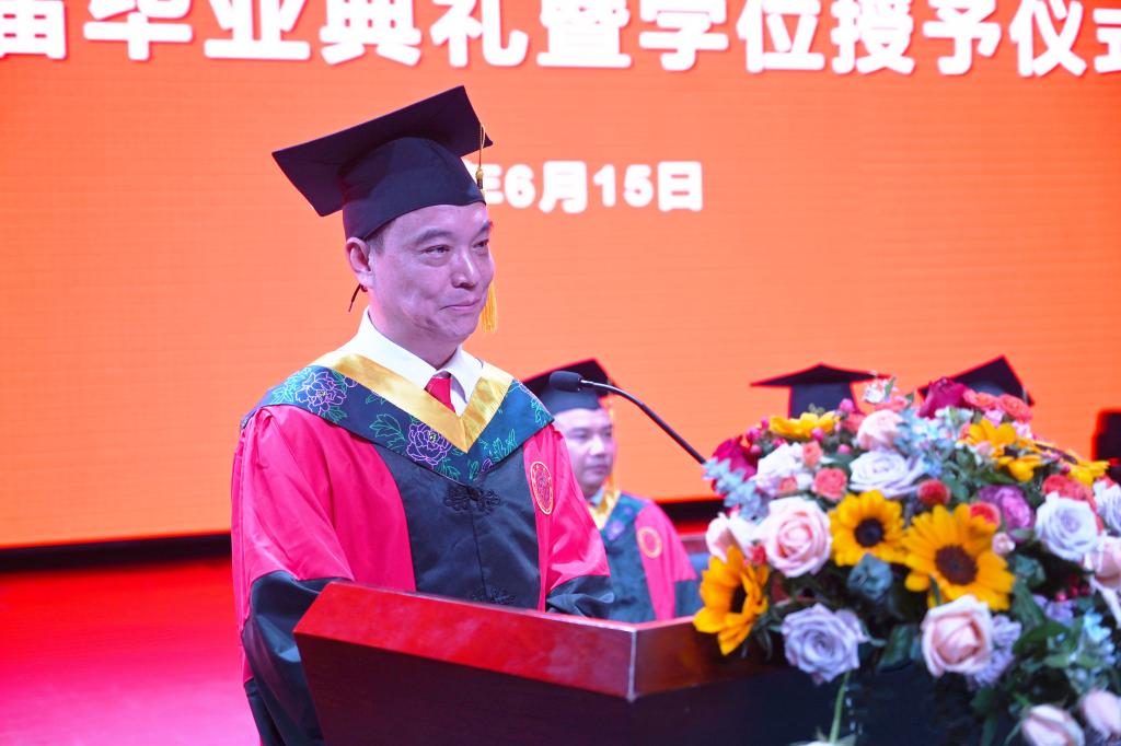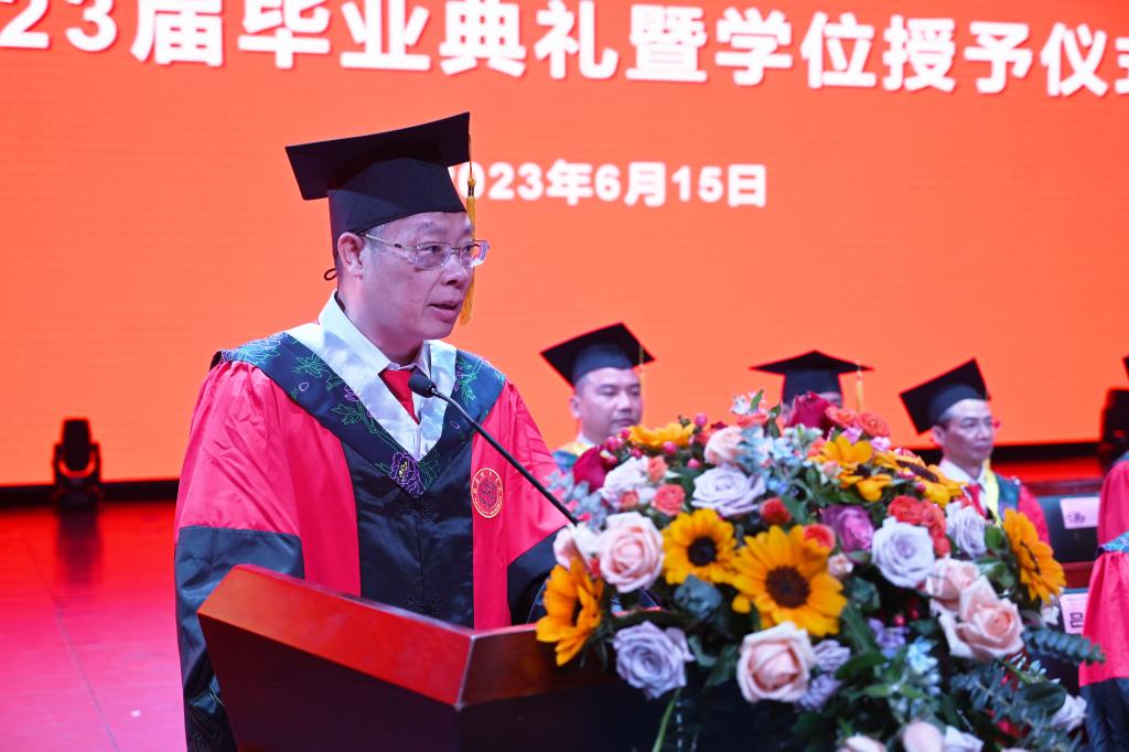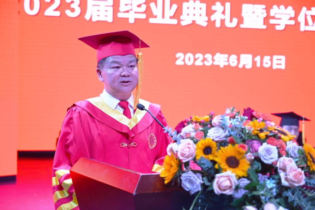陈列尊宣读了致2023届全体毕业生的“廉洁家书”。自2022年以来,我校每年给广大毕业生送上了一份特殊的礼物——“廉洁家书”,助力毕业生在清廉的人生道路上迈好“第一步”。陈列尊叮嘱青年学子常修清正之德以自重,无论身处何时何地都不能忘记修身立德,坚持向善向美向上的价值追求,努力让自己成为有德行、有品格、有格局的人;常怀干净之心以自律,不管从事什么工作,要遵守行业规范,恪守职业道德,决不触碰“高压线”;常思贪欲之害以自警,时刻紧绷抵制贪欲这根弦,保持自警的清醒,坚守底线,在大是大非和杂念妄想面前,保持冷静和定力。