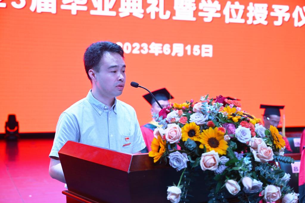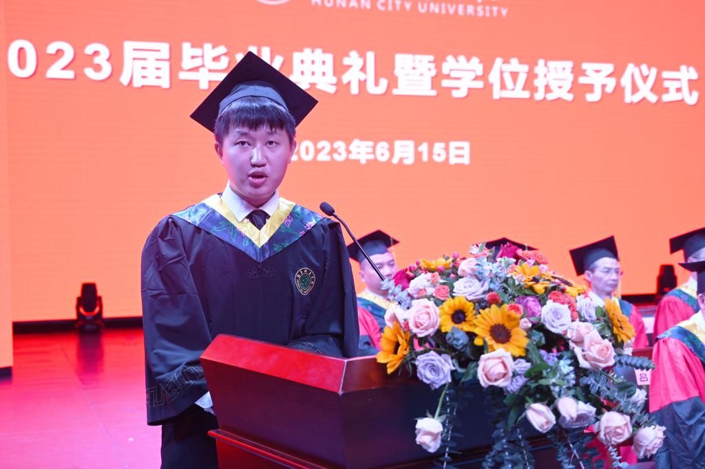 毕业生代表、湖南省优秀学生党员、土木工程学院杨润益回忆了他懵懂青涩、滚烫沸腾的青春和成长故事,对母校的悉心栽培和关爱表达感激,表示将用青春的智慧和汗水,谱写新时代城院学子璀璨的青春华章,在社会的各行各业中尽情施展才华,让青春在全面建设社会主义现代化国家的火热实践中绽放绚丽之花。