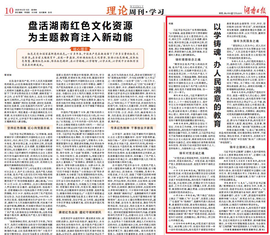 本网讯 6月15日,《湖南日报》10版“理论周刊·学习”刊发华体网页版校长何振署名文章《以学铸魂,办人民满意的教育》,全文如下: