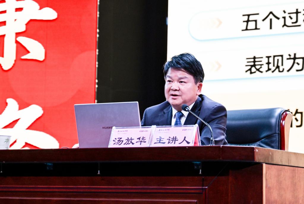 本网讯(通讯员 孔军)3月19日晚,学校2024年春季学期“开学第一课”在音乐厅举行。学校党委书记汤放华以“读懂中国式现代化”为题,为全校青年学生党员讲授“开学第一课”,报告会由党委副书记袁志成主持。各二级学院党委书记、副书记以及学生党员代表现场听课。