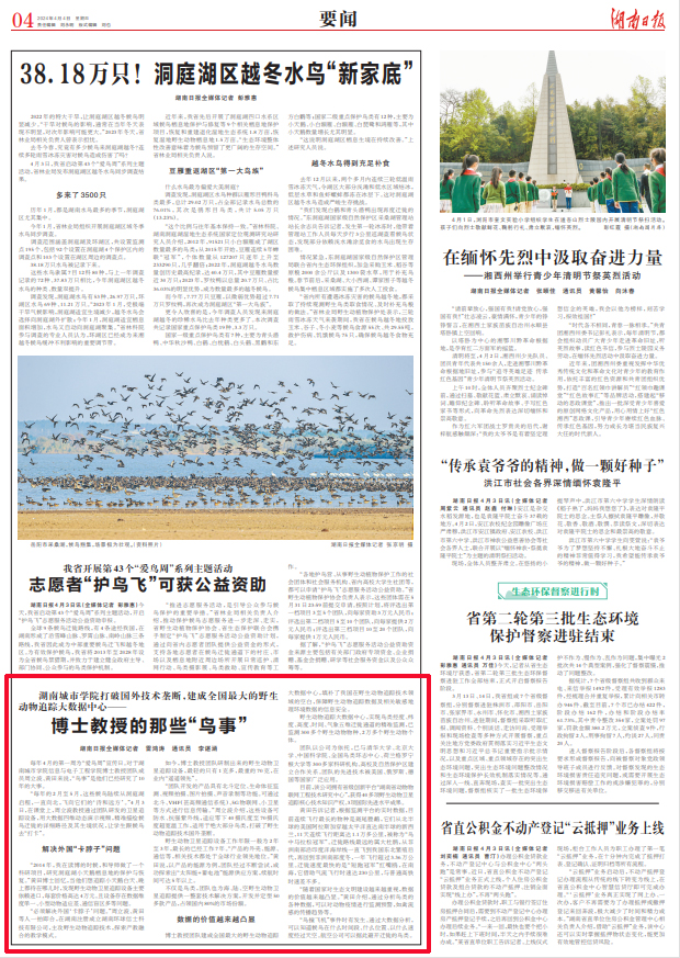 本网讯 4月4日,《湖南日报》第4版(要闻版)报道华体网页版博士教授团十年来专注于野生动物卫星追踪技术研发,打破了国外技术垄断,建成了全国最大的野生动物追踪大数据中心。全文如下: