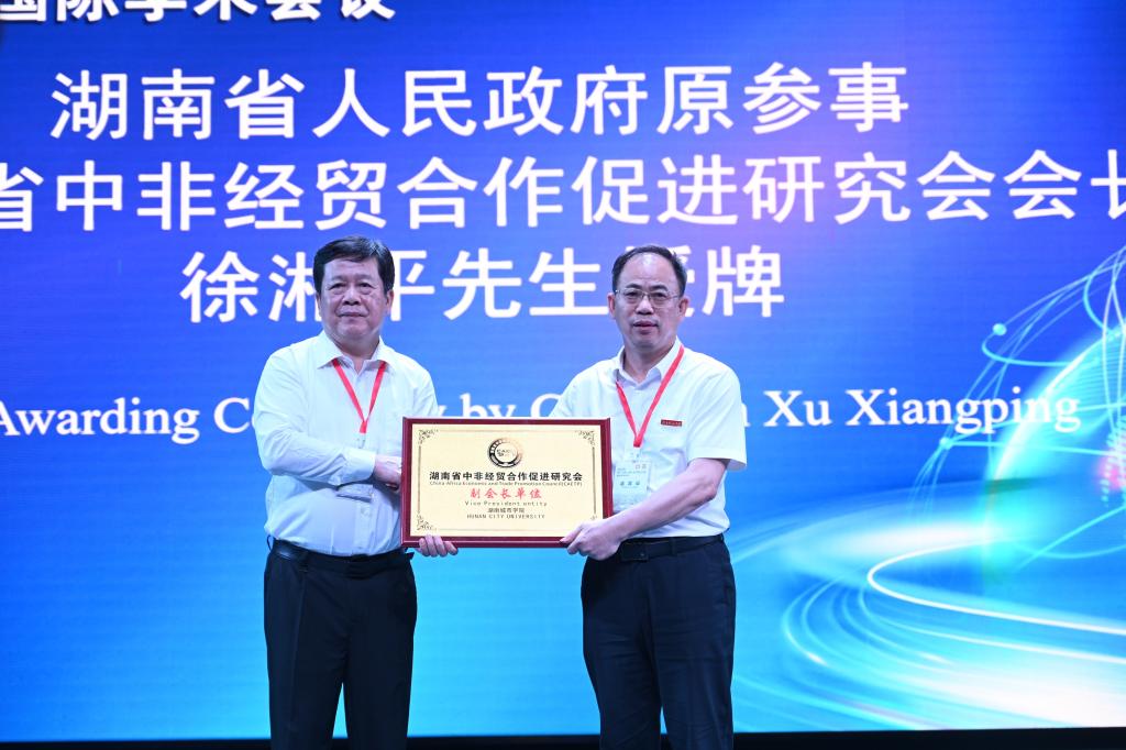 徐湘平为华体网页版授牌,学校被授予湖南省中非经贸合作促进研究会副会长单位。