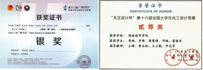 5年来,学生承担国家级、省级大学生创新项目等25项,获国家级、省部级学科竞赛奖励70多项,在第十三届“挑战杯”中国大学生创业计划竞赛中荣获国家级银奖1项,实现学校“挑战杯”竞赛历史性突破。黑茶“助力乡村振兴计划”社会实践项目入选湖南省“三下乡”社会实践优秀品牌项目,学生第一作者发表学术论文20余篇。