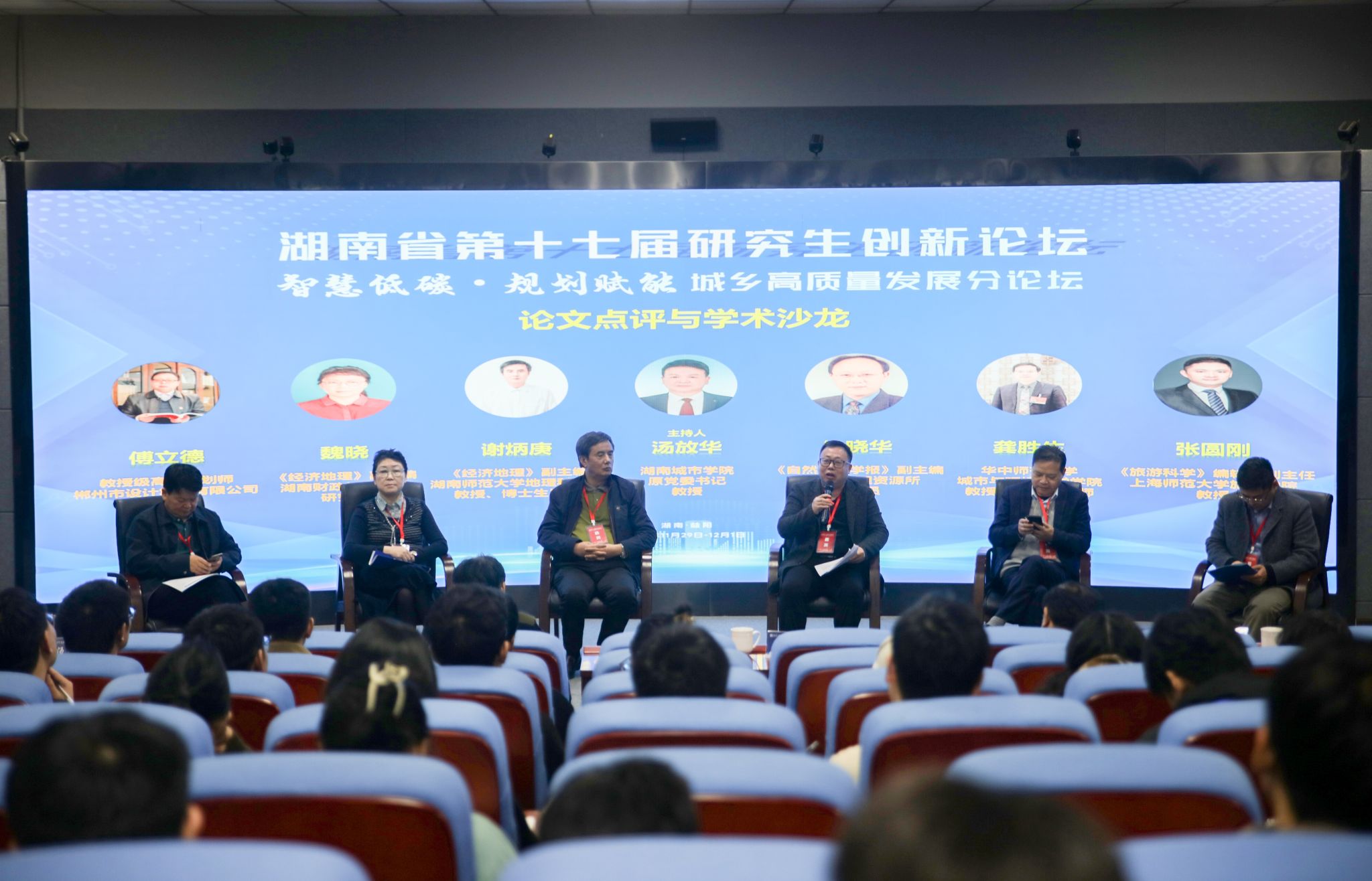 论文点评与学术沙龙环节由华体网页版汤放华教授主持。学术沙龙环节邀请了6位国内知名专家学者和与会研究生共同参与,围绕“数字赋能城乡空间规划”“低碳安全与健康城市规划”“新时代乡村振兴与规划建设”“城市设计与城市更新”等议题进行了深入探讨。