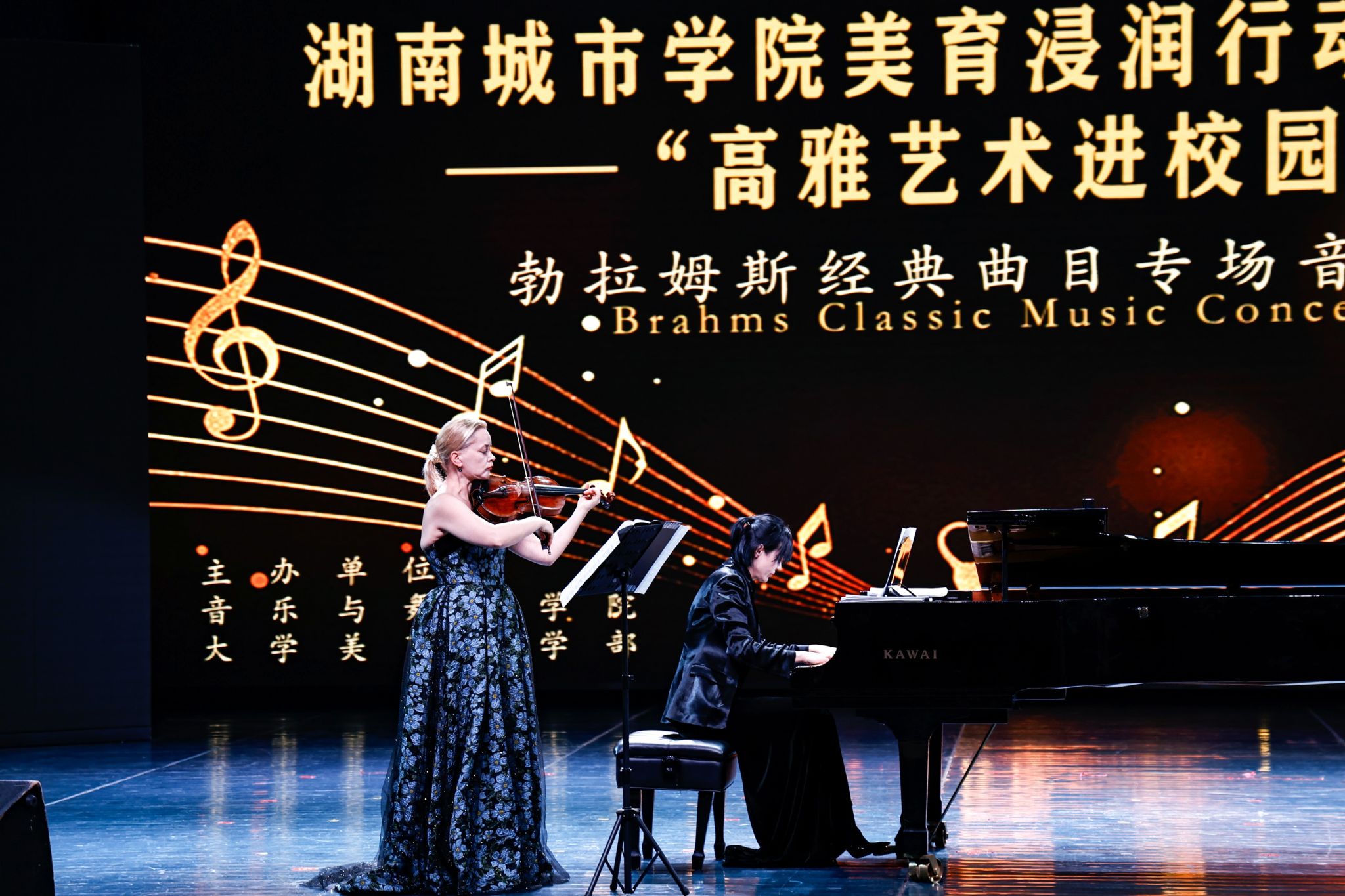 本网讯(通讯员 谢立新)1216日晚,“勃拉姆斯经典曲目专场音乐会”在音乐厅上演。由乌克兰籍钢琴家、音乐与舞蹈学院教师孙·娜塔丽雅,携手俄罗斯籍小提琴家、湖南理工学院教师安娜·加宁联袂出演,呈现了勃拉姆斯流传下来的仅有的三首小提琴奏鸣曲。