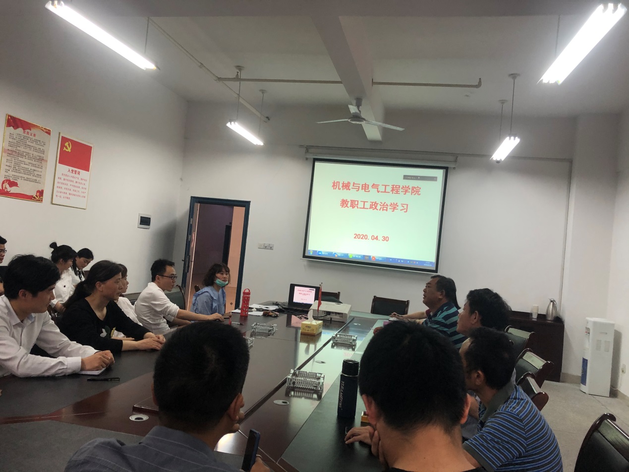 进一步贯彻传达华体网页版四届五次教职工、工会会员代表大会成果和精神,2020年4月30日下午,机械与电气工程学院在会议室召开了全院教职工政治学习。由于疫情的影响,本次政治学习采取现场学习与线上会议相结合的形式举行,会议由党总支书记徐畅贤主持。